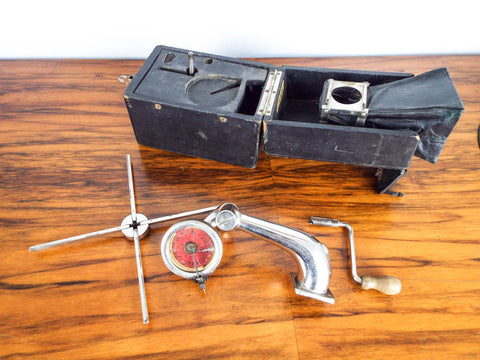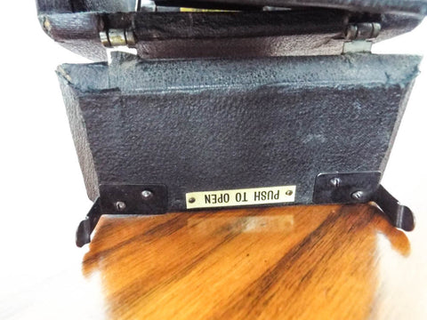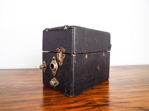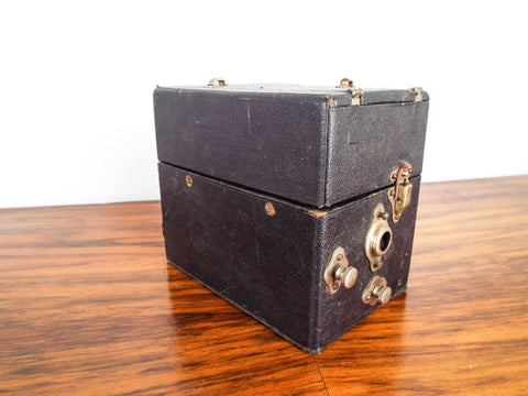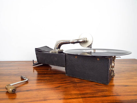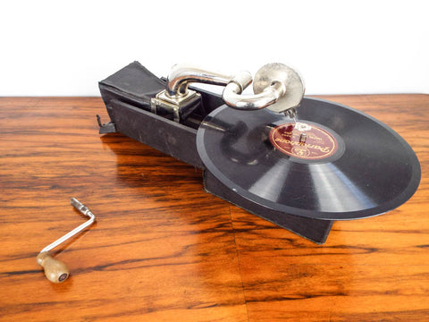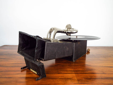 Antique Peter Pan miniature gramophone. This vintage 1920's portable phonograph which was made in England was the iPod of its day. This vintage record player was also known as a cameraphone due to its fold up size which looked like the box brownie Kodaks of the same period.