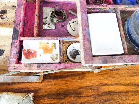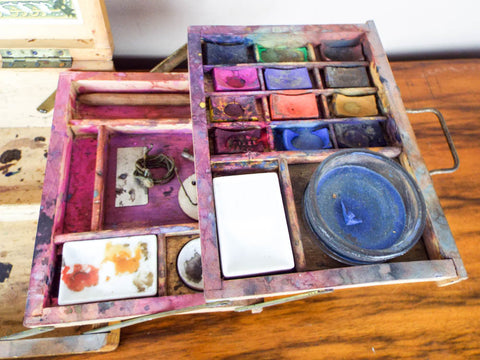 Antique French traveling painters box. Dating to around 1910 this antique fold out box retains many of its original paint blocks albeit partially used. Most likely this belonged to a young lady of means due to its delicate and light compact size. The box set retains its original mixing porcelain palettes and glass water containers. It is sparsely decorated on the front with typical art nouveau transfer imagery.