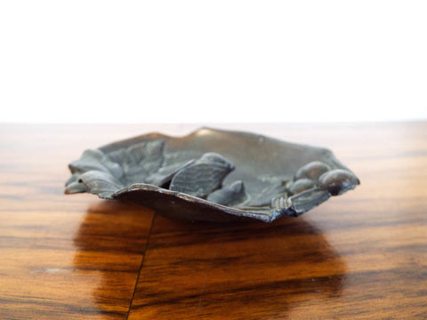 Vintage Art Nouveau pin tray. Signed pin tray depicting a cicada amongst fruit and foliage in high relief and stunning detail. this dates from the turn of the last century (1900) and most likely originates in the Austro Hungarian empire as it has a definite secessionist style about it. The German and Austrian metal worker companies were rivaling the French for ornate casting in the late 1800 to WW1 era with companies like WMF, Kayserzinn and Albert Kohler impacting the overseas consumer market. this is a superb example of yet another small company making exquisite household items into works of art.