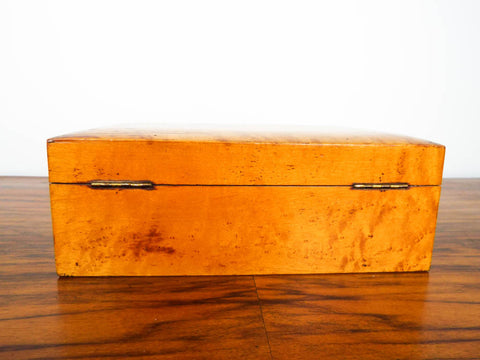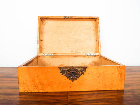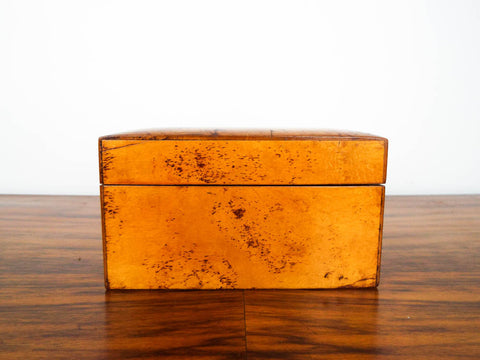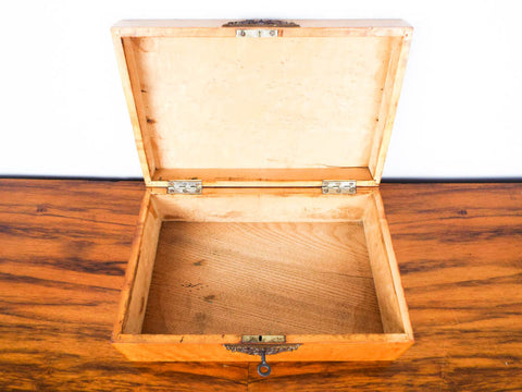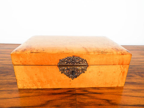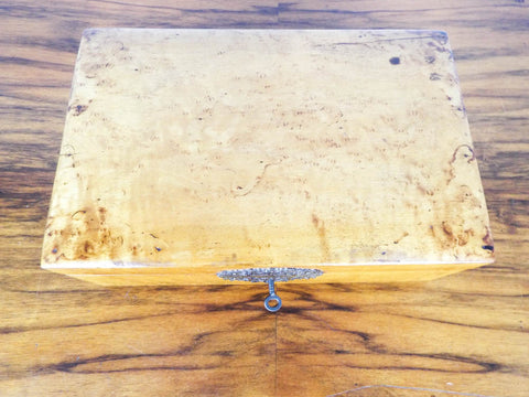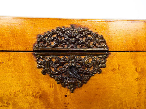 Antique birds eye maple jewelry box with key. Dating to the early 20th century this solid birds eye maple jewelry box is adorned with a decorative metal escutcheon where the key enters the locking mechanism which straddles both side of the box. The grain on the maple with all the occlusions gives it an almost 3 dimensional effect when observed under light.