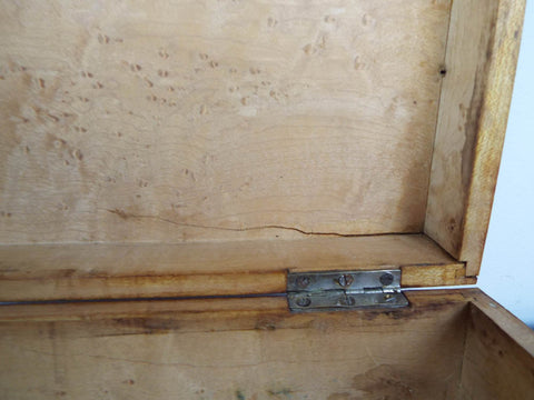 This box is in very nice condition and the key works well, there is a split in the wood grain all the way through on the top back side of the box which does not detract from its beauty (please see all photographs as they form part of the listing description).