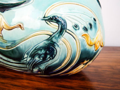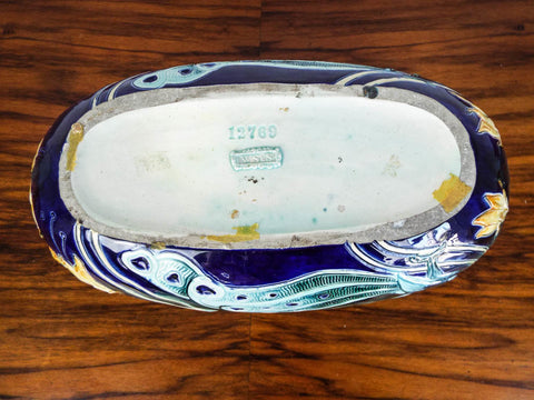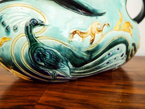 Antique Majolica center piece by Wilhelm Schiller & sons. Manufactured in Bohemia between 1885 when the company formed and 1914 when the company dissolved. This centerpiece bowl comprising of mainly muted blues, yellows and aquamarine depicts peacocks and flowers on either side in relief form. The flowing handles interlace in through the form in a typical Jugendstil style as was popular in Germanic speaking regions during the late 19th and early 20th century.
