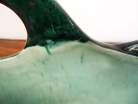 In nice condition considering age and use. Some small chipping to the glaze around the edges. There is a firing fracture on one handle that feeds through to the inside of the piece - it is photographed (please see all pictures as they form part of the condition description).