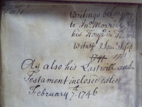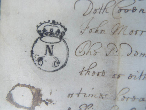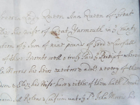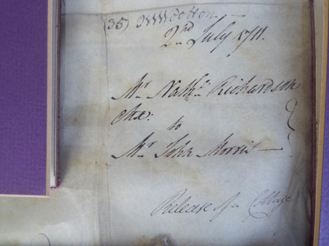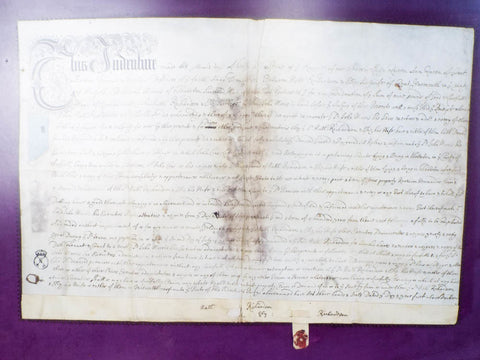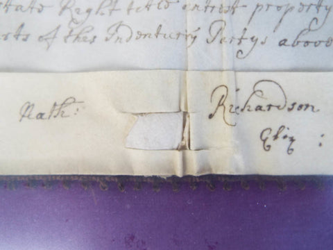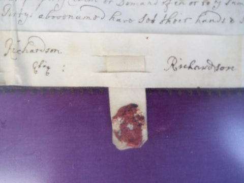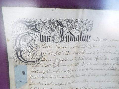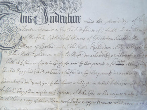 Antique 18th C framed British legal document. Dating to the turn of the 18th century this Queen Anne document is an indenture between Nathaniel and Elizabeth Richardson of Great Yarmouth leasing a cottage to John Morris. This is dated for 1711, in the ninth reigning year of Queen Anne.