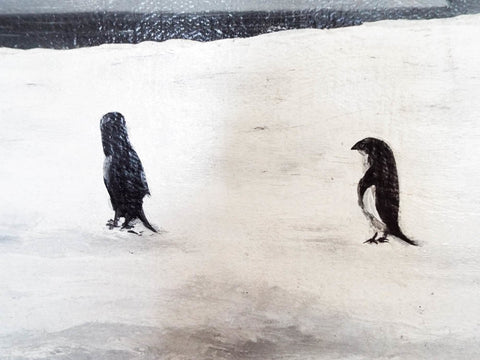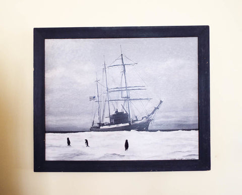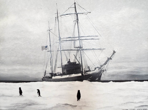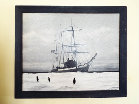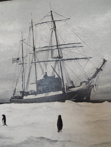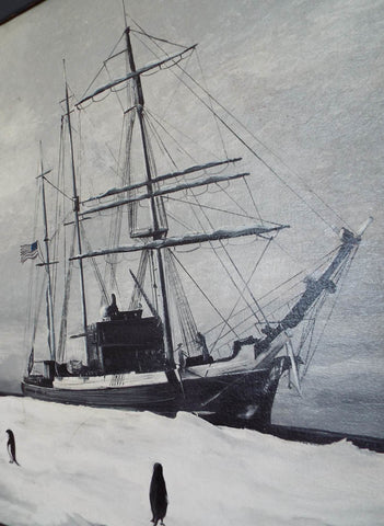 Antique USN oil painting on hardened canvas. This antique painting depicts the good ship USS Bear which was a 19th century American Coast Guard cutter moored somewhere in the arctic with penguin spectators looking on. This painting dates from between 1884 when it was purchased by the US government and 1926 when it changed its name to Bear of Oakland. It is thought that the artist was Jessie A Yandell and that this was formerly displayed in the US Naval Academy in Annapolis, Maryland.