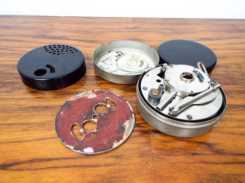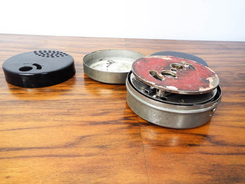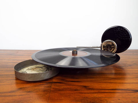 Vintage 1920's Vadasz brothers mikiphone. This original pocket phonograph is designed in the shape of a small clock which opens out to reveal a phonograph. This is a rare version of a folding mikiphone phonograph designed by Hungarian Vadasz brothers in 1924. Contracts were signed with the Paillard company of St Croix and most were made in Switzerland from this point onwards. Complete with a great aesthetic look this fully working miniature phonograph is a must have for the serious collector. It is wound up via the alarm clock style wider on the top.