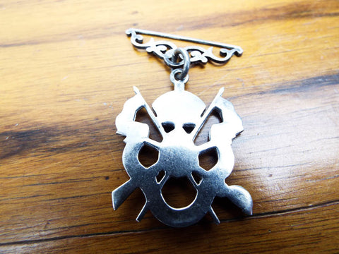 Antique sterling silver Temperance medal. Silver Royal Army Temperance Association medal which would originally have suspended from a ribbon to be worn by members of the British arms temperance association. Struck in sterling most likely in India where this organization was founded during the 19th century. It depicts crossed lances holding the banner, sword, rifle with a helmet all under the crown (who was the patron sponsor of Temperance associations). This medal dates from the 19th century as intimated by the crown and ribbon bar design.