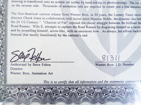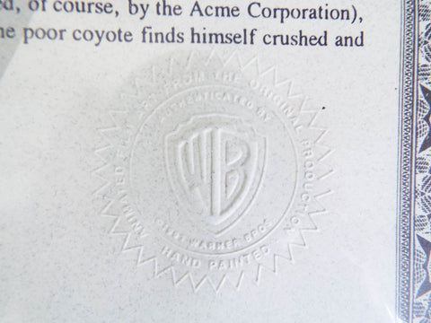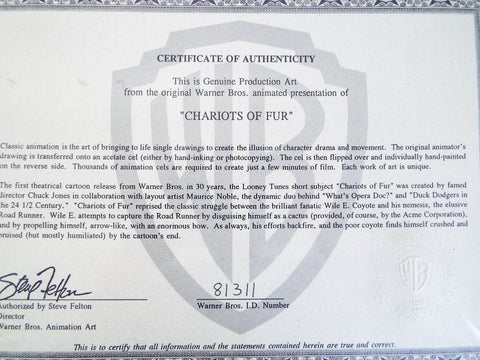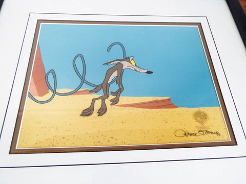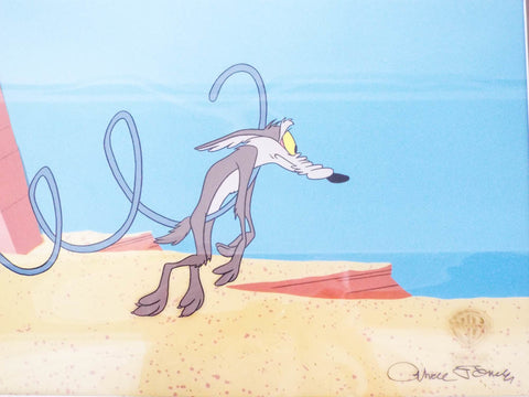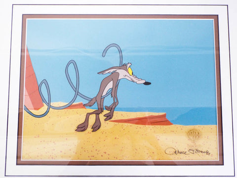 Vintage original sericel or Warner Brothers Wile E Coyote. Invented and signed by legendary animator Chuck Jones (1912-2002) this sericel was used in the animated movie " Chariots of Fur". The scene depicts the ever hapless Wile E Coyote on the precipice of disaster as another failed plan from his Acme merchandise leaves him dejected. This piece of collectable art comes with its original certificate of authenticity from Warner Brothers and is dated 1995.
