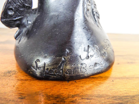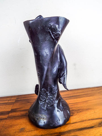 Vintage Art Nouveau bronze metal vase. Vintage patinated bronze vase surrounded by butterflies and a winged nymph with a blindfold. The wood nymph lies prostrate across the vase acting almost like a handle. She may be a reference to the lost wood nymphs story from Germany. This dates to the 1910's period and most likely was made either in France, Germany or Austria. This piece is signed on the bottom twice but unfortunately I cannot fathom the name. I have given the name I believe it reads.