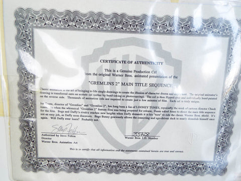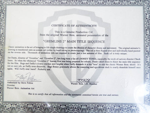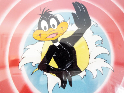 Vintage Daffy Duck serial by Chuck Jones (1912-2002. Original cel which was used in the movie "Gremlins 2" is accompanied on the back of the frame with a certificate of authenticity from Warner Brothers. Daffy is breaking through the Looney Tunes circle as was the signature sign off of Jones for years at Warner Brothers. During his tenure at WB he helped develop Daffy Duck stating