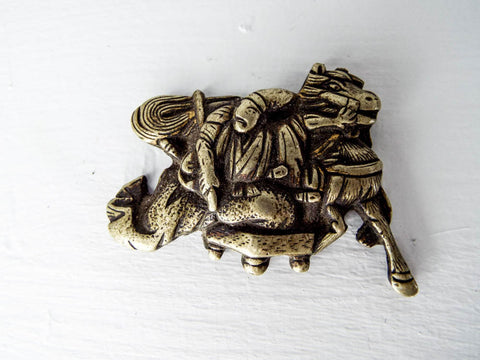 A small heavy brass decoration depicting a soldier mounting his horse. Full of detail and movement this piece may have been the top of a larger piece or mounting on a saddle of a warrior. Again this only has one side.