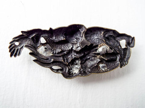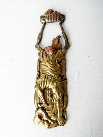 A Shakudo or mixed metal single obverse side of a brass letter opener. This high relief ornate (or repousse) casting depicts a man with very long arms offering up a basket of fruit to the Gods. The reverse side is missing, which may have been a mirror image of this side.