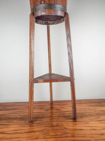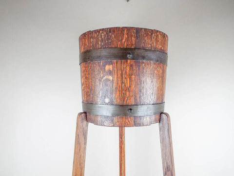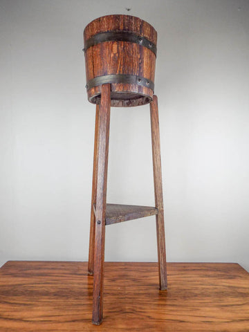 Antique English barrel plant oak fern stand jardiniere. Arts and crafts era plant pot holder made in England by R A Lister & co ltd around 1920. All oak in construction except for two brass supporting rings around the bucket. Marked with the makers celluloid plaque on the inside this arts and crafts oak stand is typical of the British movement of the period.