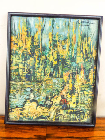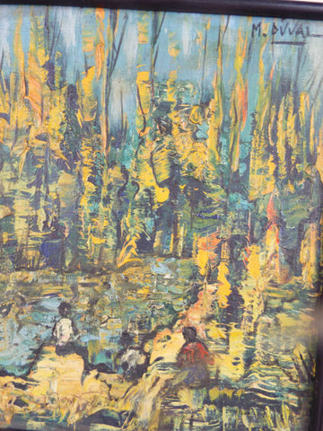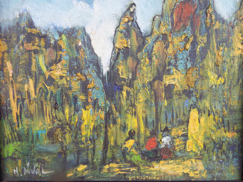 Vintage pair of oil landscape paintings. Beautiful palette knife paintings in an impressionistic style painted by M Duval. These stunning forest landscapes are beautifully colored with heavy swathes of palette paint showing figures in the foreground upon closer inspection. These date to the 1950's or 1960's.