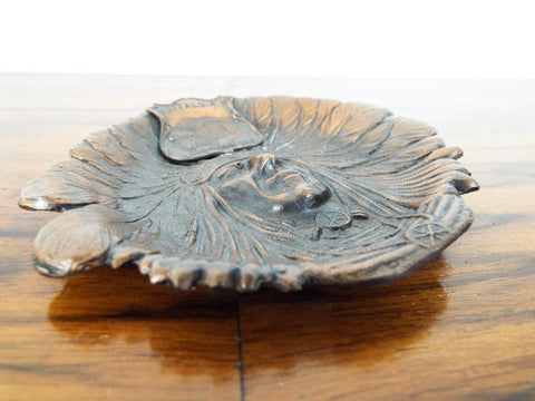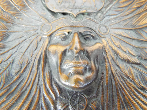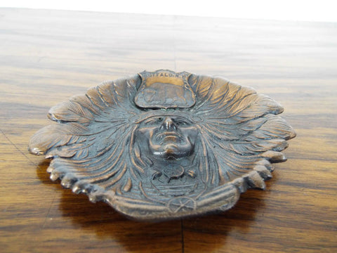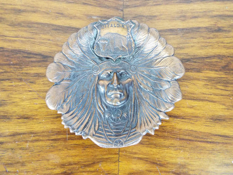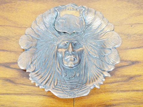 Vintage K & O Indian Chief souvenir pin tray. Made from cast metal as a souvenir from Buffalo NY by the Kronheim & Oldenbusch company this beautifully ornate pin tray depicts a native American in high relief on the front. His head dress extends to the edge of the dish to act as a feather edge with an overlaid shield on top depicts the town and image of a Buffalo. This piece dates to the late 1920's or early 1930's.