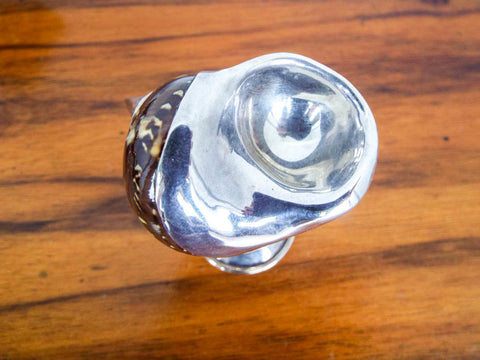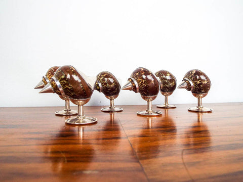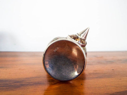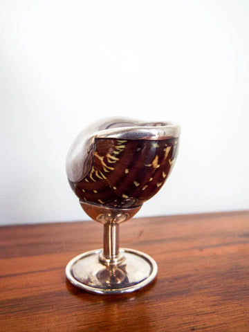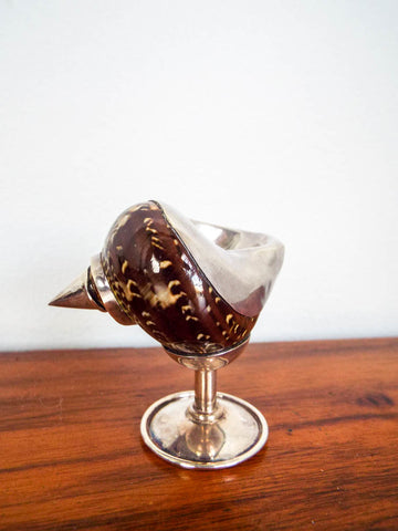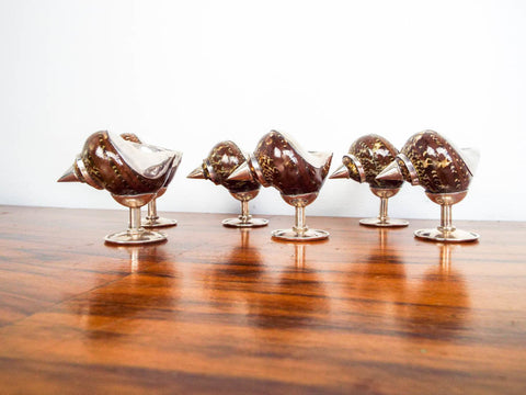 Late 20th century set of six salt cellars or dips. Each one is silver clad and styled as a snail shell situated atop a sterling pedestal. Each piece is marked ''925'' for sterling silver. The bowl is silver clad with a continuos line of silver enveloping the side culminating to a highly stylized point which almost gives them the appearance of birds. Highly polished in an unusual form these salt cellars would grace any table with a touch of panache. Not only are they aesthetically beautiful but completely functional for their design. In olden days the idea of individual salt cellars at a table intimated a persons wealth and status when salt was a coveted commodity.