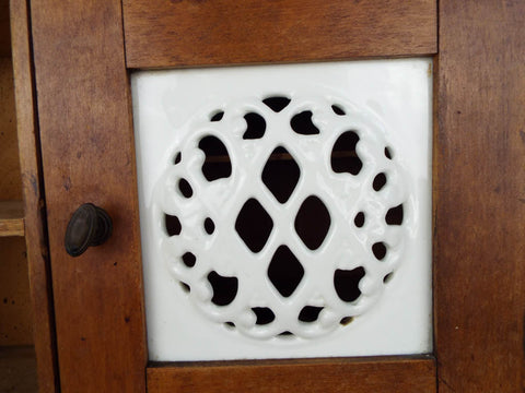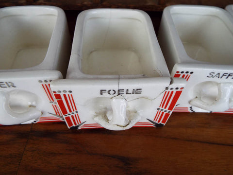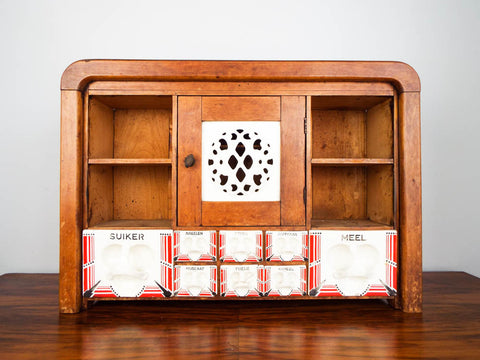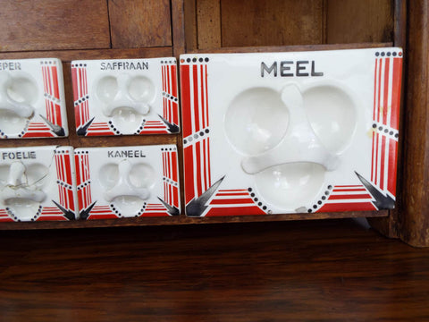 Vintage wooden Dutch brocante herb spice rack. Dating to the 1930's the wooden cabinet retains many of its original ceramic containers and the original egg trays in the center. This was exported from Czechoslovakia for the Dutch market in the 1930's as attested by the typical art deco designs on the front.