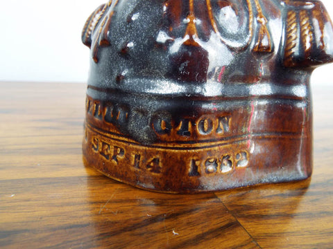Antique Rockingham 19th C treacle glazed Lord Wellington memorial toby jug. Made in memorial of the Duke of Wellingtons death (1769-1852) who was the field marshal of Great Britain until his death. His passing was marked by a state funeral with all the usual adornments of a national military hero of the 19th century.