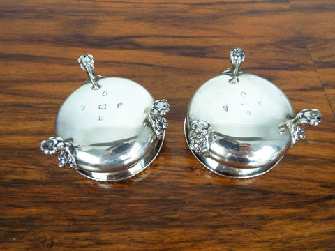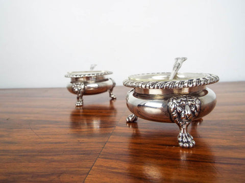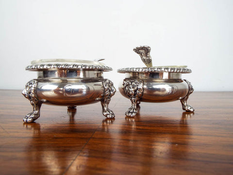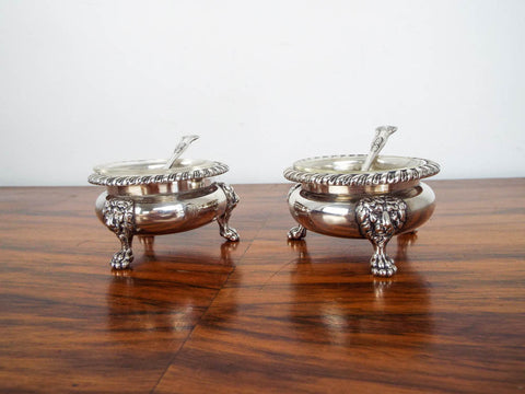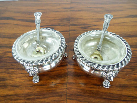 Antique sterling silver Georgian open cauldron salt cellars. A pair of British silver open salts made in Sheffield in either 1811 or 1826, unfortunately the makers marks is rubbed beyond recognition. These pair of heavy pot bellied salt cellars are ornately decorated on the top rim with wavy gadroons and sit on three lion paw feet with lion head shoulders. Fully hallmarked underneath they include their thick glass inserts.