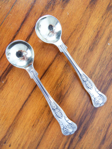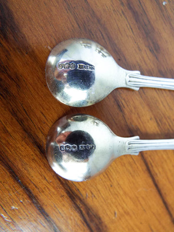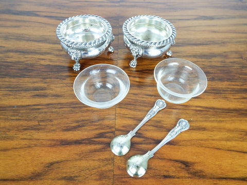They are accompanied with two later Victorian sterling silver salt spoons made by James Dixon & sons of Sheffield in 1884. Both are fully hallmarked under the bowl and decorated with scallop shells and foliage on the stem.